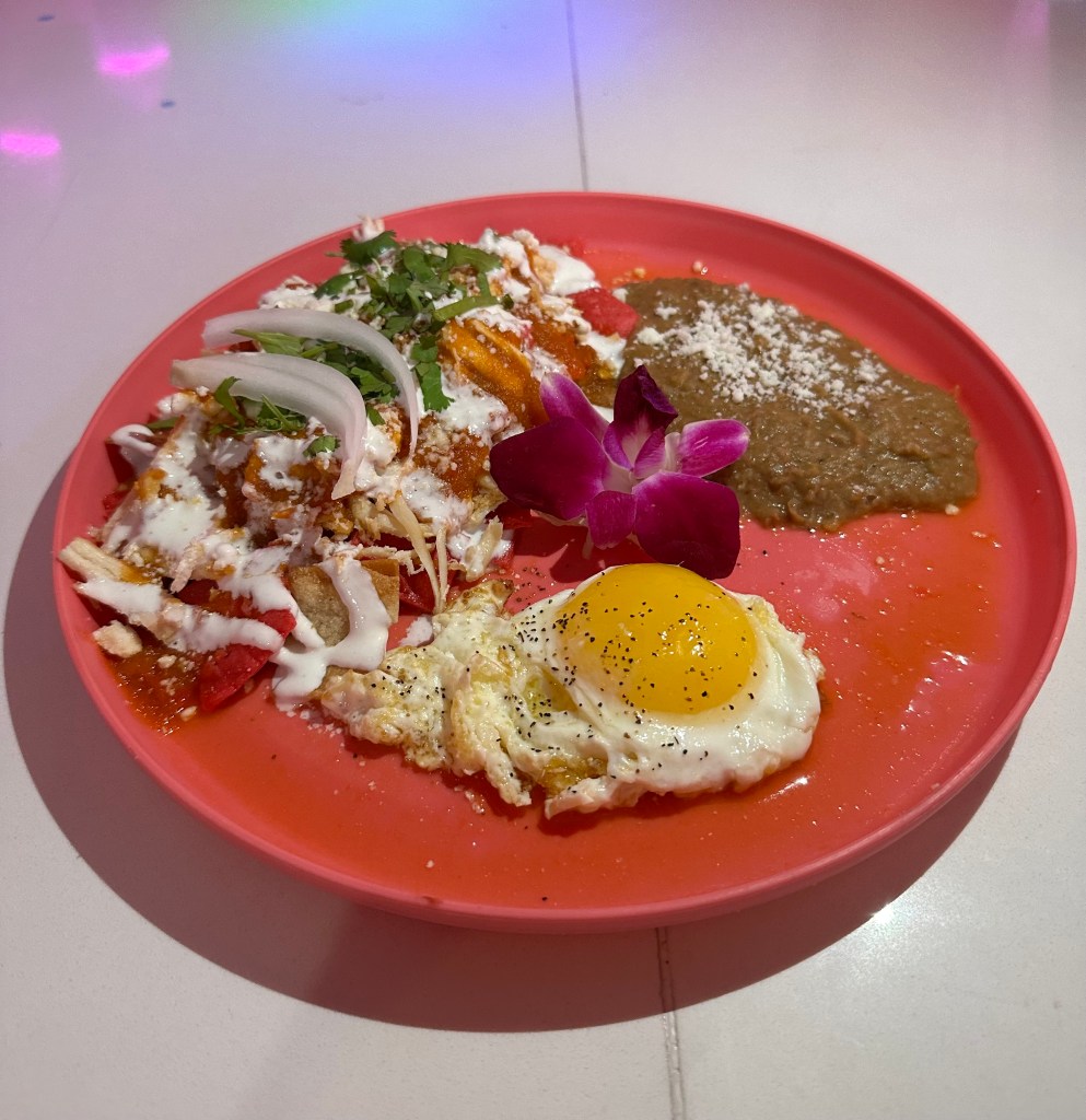 Their Pink Chilaquiles were served with a mild red salsa, chicken, cheese, one egg over easy, and flavorful refried beans.